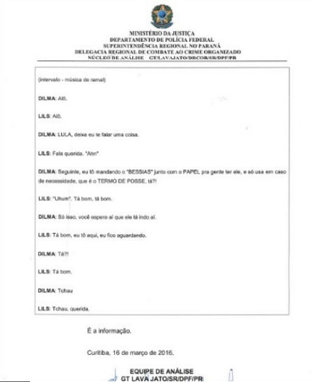 - Dilma: Seguinte, eu tô mandando o 'Bessias' junto com o papel pra gente ter ele, e só usa em caso de necessidade, que é o termo de posse, tá?!