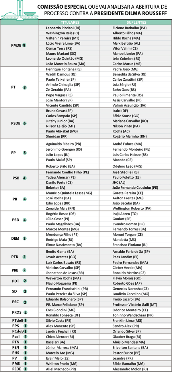 Câmara instala comissão de impeachment e escolhe presidente e relator. O colegiado será presidido pelo deputado Rogério Rosso, do PSD. O relator será Jovair Arantes, do PTB.