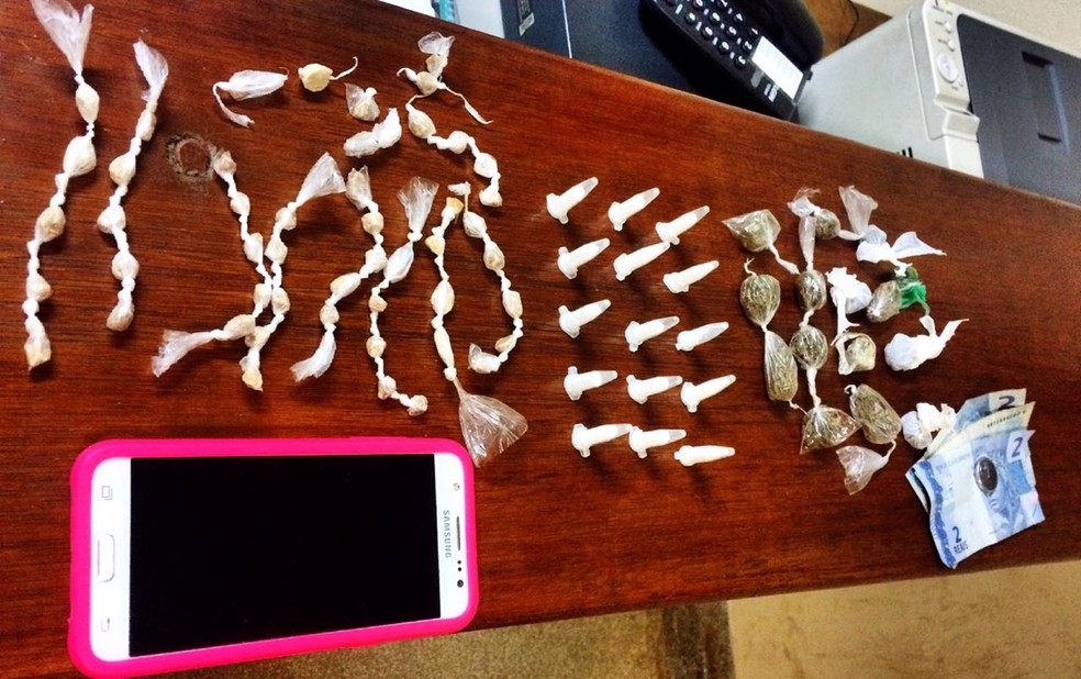 Chegando ao local, a equipe encontrou a suspeita e, em buscas pessoais, foram encontradas 15 porções de cocaína, 10 pedras de crack, cinco de maconha e R$ 6,50 em dinheiro.