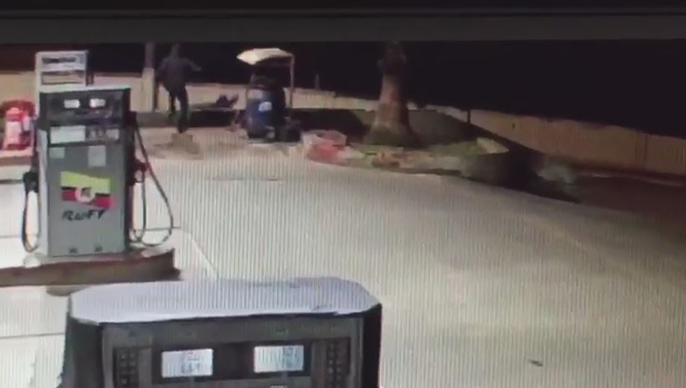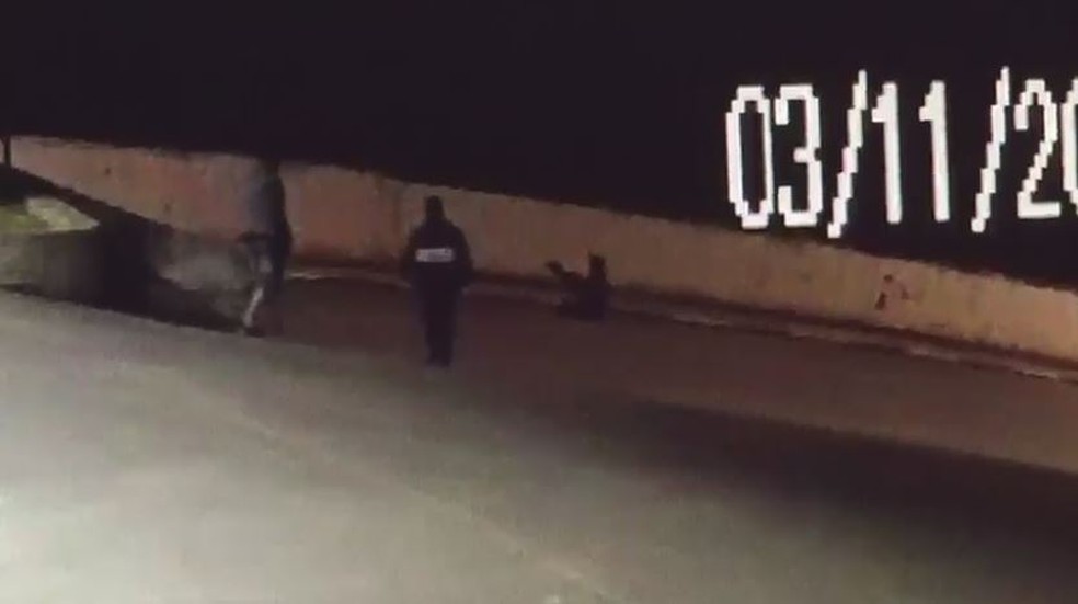 Enquanto tenta fugir do ladrão, o funcionário pula uma mureta e o criminosos faz o mesmo. Porém, na sequência, o funcionário aparece voltando para o posto e o ladrão surge mancando do outro lado da rua.