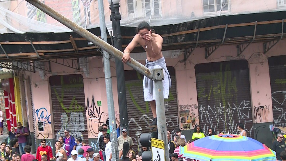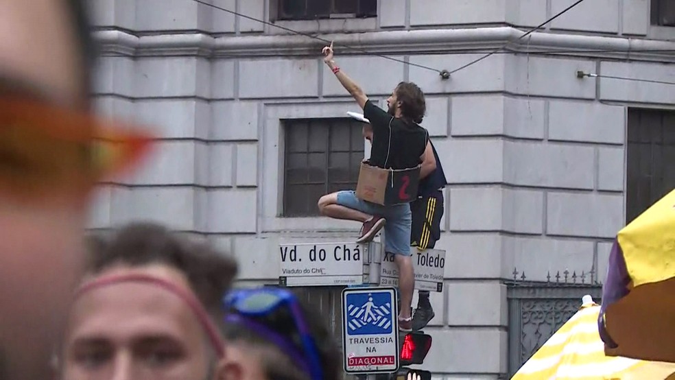Estudante sobe em poste durante peruada de alunos de direito no Centro de São Paulo — Foto: TV Globo/Reprodução