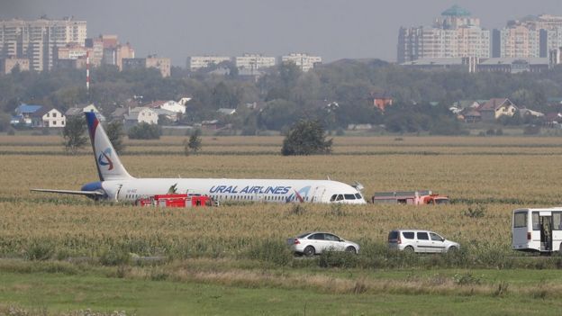 Um avião de passageiros de uma companhia russa fez um pouso de emergência em um milharal próximo a Moscou, depois de ter sido atingido por um bando de pássaros.
