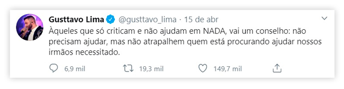 Em seu twitter, o cantor destacou que, além de interagir com o público, as lives visam arrecadar alimentos, e afirma: "não atrapalhem quem está procurando ajudar nossos irmãos necessitado".