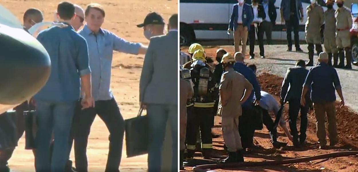 Bolsonaro chegou de helicóptero, acompanhado dos ministros Eduardo Pazuello, Braga Netto e Marcos Pontes. O governador de Goiás, Ronaldo Caiado (DEM), também acompanhou a cerimônia.