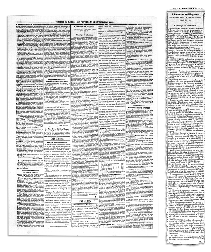 O folhetinista é uma planta moderna, originária da França, aclimatada hoje em todos os países civilizados: brotando ao contato de todas as atmosferas. Trouxe-nos o bom vento do progresso essa produção curiosa do século XIX, como o vento do outono traz uma folha escapada das florestas. Estudá-la é de certo uma tarefa difícil e espinhosa. Escrever, porém, a fisiologia do folhetinista, é uma coisa tão nova, que eu de certo, animo-me a desempenhar tão terrível encargo, sem recear muito pelo resultado: a fecundidade do assunto disfarça os “senões” da pena.