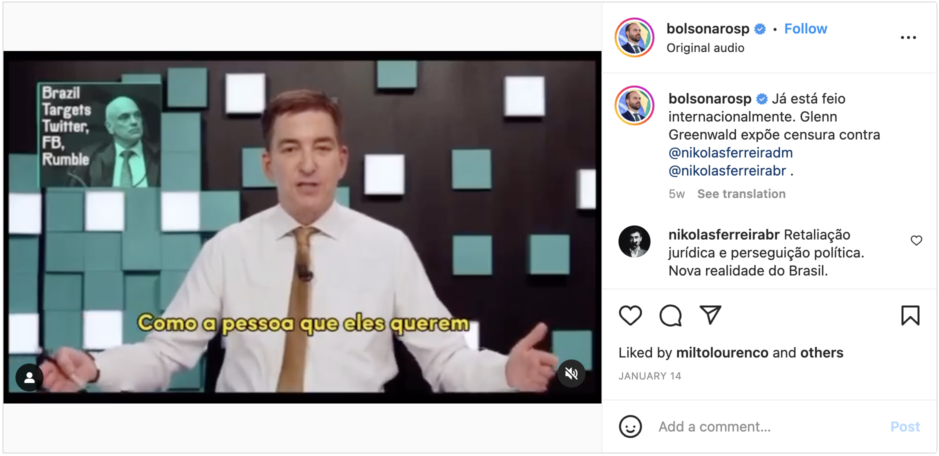 Eduardo Bolsonaro elogia Greenwald por sua defesa do golpista Nikolas Ferreira
